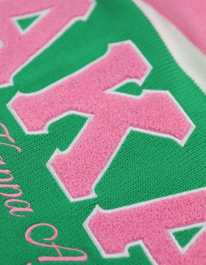 - Chenille shield on front